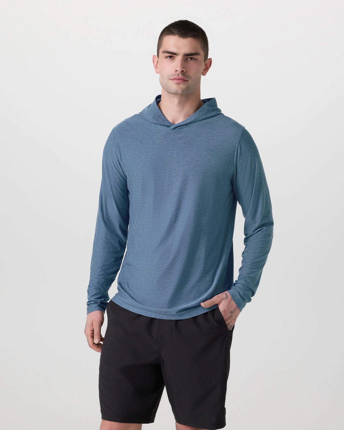 The Vuori Strato Tech Hoodie elevates the unmatched softness of the original Strato Tee into a versatile hoodie designed for performance and comfort. Crafted with moisture-wicking fabric, it keeps you dry and comfortable through intense sprints or light spring training sessions. The modern athletic fit offers a streamlined silhouette that supports mobility without restriction, making it an ideal base layer for layering or wearing solo. Designed to hit at the hip, this hoodie combines technical functionality with a sleek, classic look, providing exceptional softness and durability for your active lifestyle.